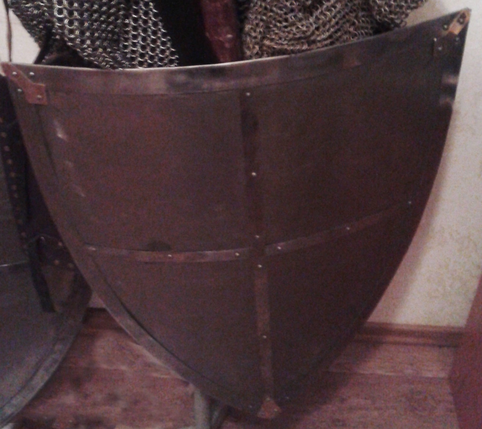 В отличие от фанерных версий щитов, стальной щит более подходит для интерьера, так как благодаря заклепкам, выглядит он более фундаментально.